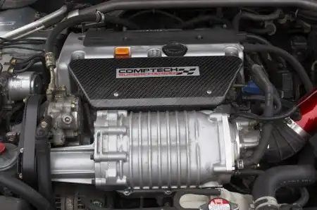 Один из владельцев Accord согласился на отступление от «атмосферной» идеологии Honda, и тогда решение задачи повышения мощности и момента двигателя нашлось быстро. Всем известно, что в США механическим нагнетателем воздуха готовы «наддуть» буквально все, что под руку попадется. Компания Comptech предложила полный установочный кит на «аккордовский» 2,4-литровый агрегат и пообещала дополнительные 50 л.с. и более 40 Нм крутящего момента. С установкой комплекта проблем не возникло. Однако «мозг» европейской Accord наотрез отказывался работать с новым «инородным» элементом под капотом. В итоге настройка электроники заняла пять (!) месяцев. Блок управления двигателем заменили на комплекс, перепрограммированный Hondata с учетом данных 9000RpM. Главное, что все системы теперь работают нормально.