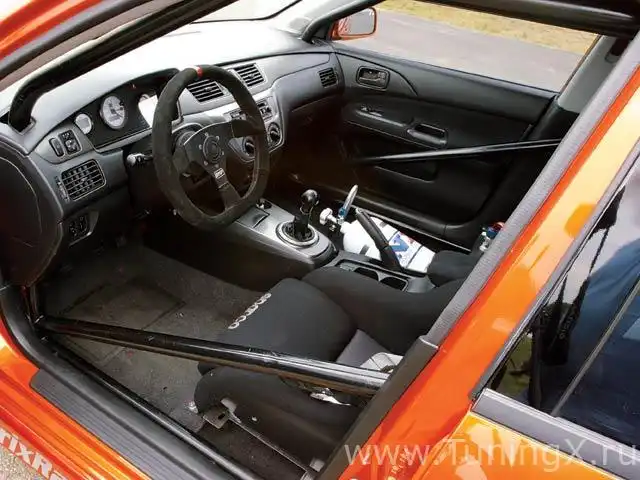 За распределение веса отвечают винтовые амортизаторы TEIN, благодаря которым у Turbotrix появилась возможность регулировать параметры амортизации и высоту дорожного просвета. Пожалуй, самая ощутимая потеря – отсутствие заводских тормозных скоб EVO спереди, вместо которых поставлены комплекты с Eclipse GSX 1999. Это было сделано, чтобы появилась возможность установить 16-дюймовые шины Hoosier. Для дороги на EVO устанавливается более традиционный 16-дюймовый комплект из дисков Volk Racing LE 37 и шин Kumho 245.