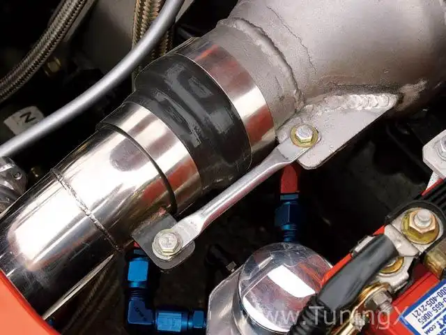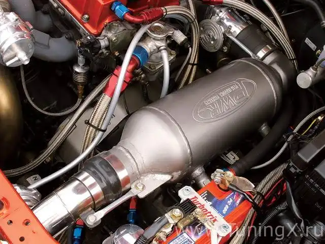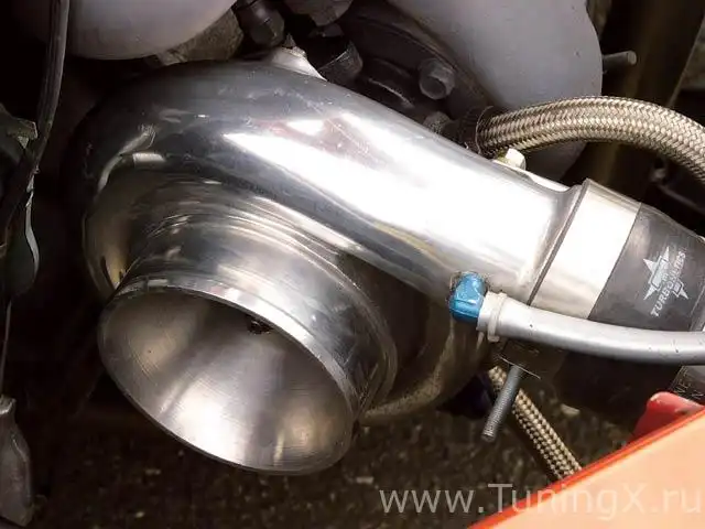 Давление наддува обеспечивается новейшим турбокомпрессором T4 с подшипниками качения, разработанным специалистами Turbotrix. Кроме него, в систему турбонаддува входят интеркулер PWR воздух-вода, 46-мм распределительная труба TiAL и предохранительный клапан TiAL. За давлением следит контроллер Hallman Pro. С «горячей» стороны сделанная на заказ 3,5-дюймовая труба из нержавеющей стали отводит отработанные газы в изготовленную на заказ 4-дюймовую выхлопную систему Turbotrix с глушителем Burns Stainless.