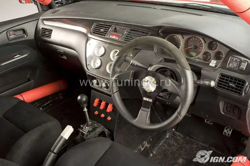 В целом можно заметить, что общей темой для всех машин из «Тройного форсажа» стало такое понятие, как простота. Вот и Эво не стал исключением. Особенно салон. Здесь остались заводские сиденья Recaro, только ремни заменили на спортивные 4-точечные Takata. Руль тоже сменили – на Sparco, с возможностью быстрого возвращения в исходную точку. Немного карбона есть и тут – стандартную аудиосистему сменила вставка из углеволокна от ARP с датчиками.