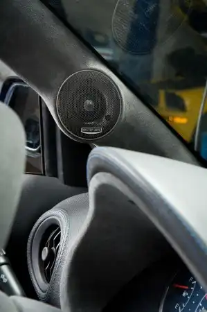 Твитеры фронтальной акустики устанавливались в среднюю часть передних стоек, а после нахождения оптимального расположения твитера, стойка перетягивалась серой алькантарой. Для мидбасовых динамиков были спроектированы и изготовлены внутренние подиумы, использование которых позволило организовать оптимальный объем практически без изменения штатной стилистики дверей.