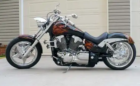 Конструировал новую раму типа Harley - Davidson с горизонтально расположенными амортизаторами. К ней лучше всего подходила передная вилка типа паралелограма сделанная из частей автомобиля Опел Дипломат. Переднее колесо выработано из стальной проволки, металолома, обруча из ИЖ 350 и диска из MZ 251. Заднее колесо принадлежало старому автомобилю Lincoln 1960 и на нем 100 самодельных спиц.