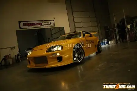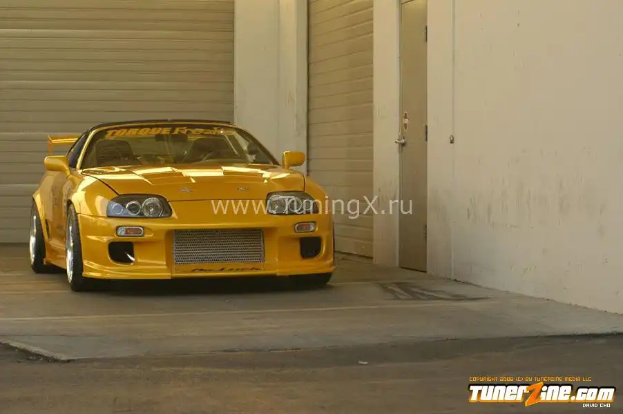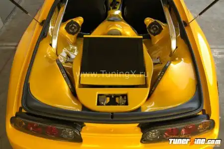 Титановые пружины и тарелки пружин Crower, 272-градусные распредвалы HKS, шестерни распредвалов HKS, турбина Turbonetics T-66, вестгейт TiAL 46 мм, блоу-офф HKS, 3-слойный интеркулер GReddy передней компоновки, индивидуально изготовленный впуск MaxRev, блок дроссельной заслонки Accufab 90 мм, впускной коллектор VirtualWorks, топливная система MaxRev (индивидуально изготовленные топливные рейки, форсунки 590сс, два погружных топливных насоса, топливный регулятор SX), AEM EMS, выпускной коллектор MaxRev, даунпайп RMM, выпуск TRD, 2-дисковое сцепление Centerforce.