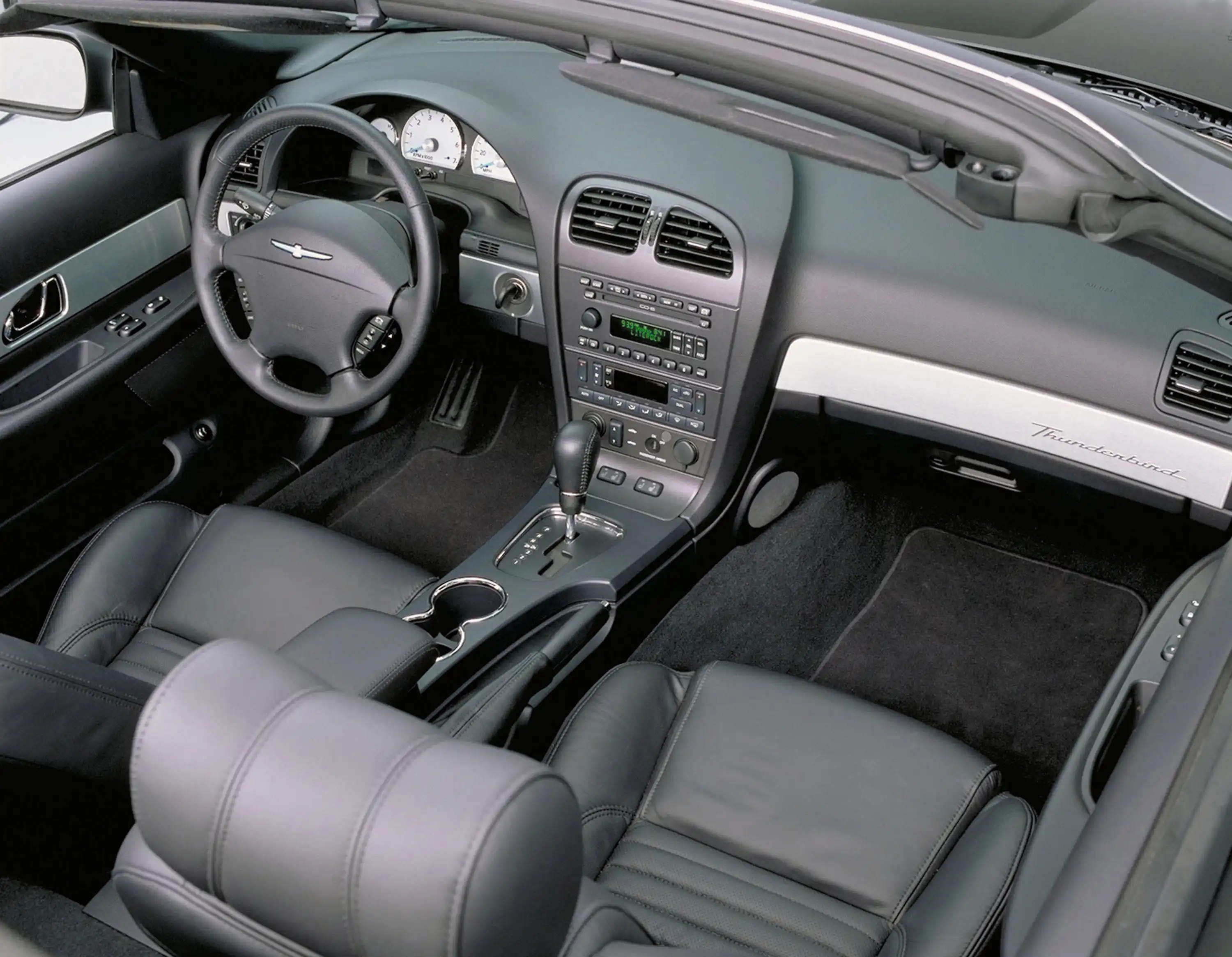 Салон Thunderbird 2002 года в точности повторяет интерьер Lincoln LS. Конструкция обтекаемой центральной приборной панели очень хорошо продумана. Приборы расположены так, что их прекрасно видно водителю, а аудиосистема и система климатконтроля располагаются таким образом, что ими очень легко пользоваться. Несмотря на то, что внешность автомобиля выполнена в стиле ретро, его интерьер отличается современностью дизайна. Обивка сидений, отделка руля и рычага переключения передач может быть выполнена в одном из 3 цветов: Inspiration Yellow, Torch Red or Thunderbird Blue.