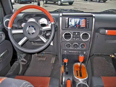 Ultimate, по сути, тот же пятидверный Wrangler, только наряженный и накрашенный. Дизайнеры здесь, кажется, перестарались. Снаружи практически всё, что выступает за плоскость кузовных панелей, — ручки, зеркала, буксирные «кнехты», защёлки, подножки, решётки на фонарях - покрыто хромом о семи слоях. О как! Не бойтесь, салон тоже не оставили в покое. Теперь в нём чёрная кожа разбавлена матерчатыми апельсиновыми вставками. Весело получилось?