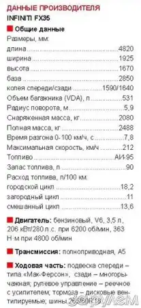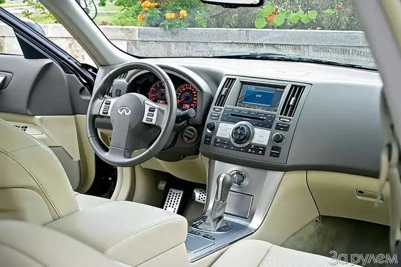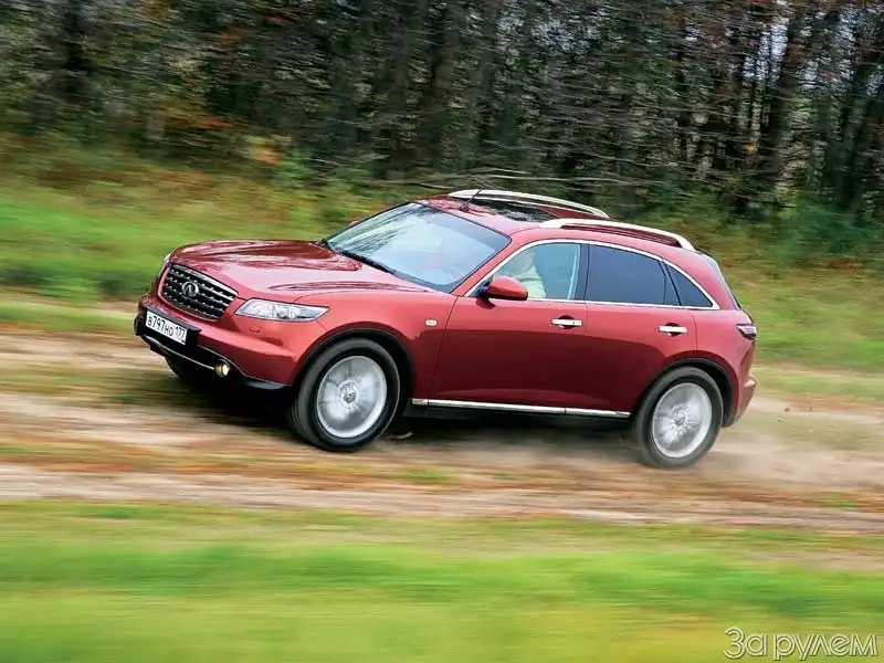 Выбор у покупателя есть: более скромная комплектация «Элеганс» c 18-дюймовыми колесами – она на 3600 долларов дешевле. Другой вариант – тот же «Премиум», но с мотором мощностью 328 л.с. вместо 280. Кроме более резвого двигателя, FX45 отличается отделкой салона мозаичным палисандровым деревом, релингами на крыше и хромированной окантовкой стекол. Ехать на таком авто по грунтовой дороге можно, лишь если опаздываешь в гольф-клуб...
