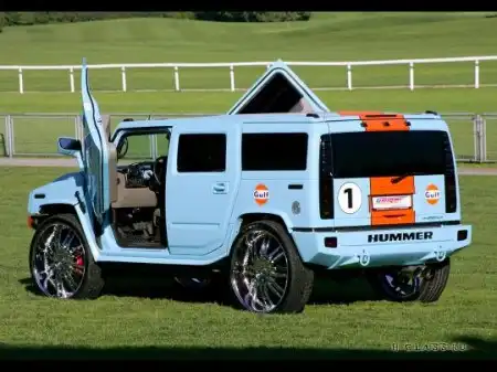 Конструкция кузова HUMMER H2 от GeigerCars модернизирована в сочетании традиционной ярко-ядовитой раскраской немецких тюнеров - светло-голубая и оранжевая специальная краска, а также огромный стикер, подтверждающий законное лидерство на дверях. Передние двери могут открываться традиционно или модно, как гильотина.