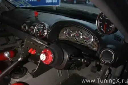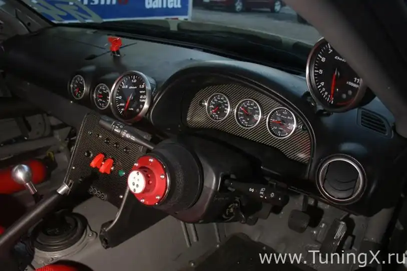 В салоне безопасность водителя обеспечивается изготовленным на заказ каркасом безопасности, а сидения JIC обеспечивают комфорт. Ремни безопасности от OMP также обеспечивают безопасность водителя, а информацию водитель получает от приборов DEFi.