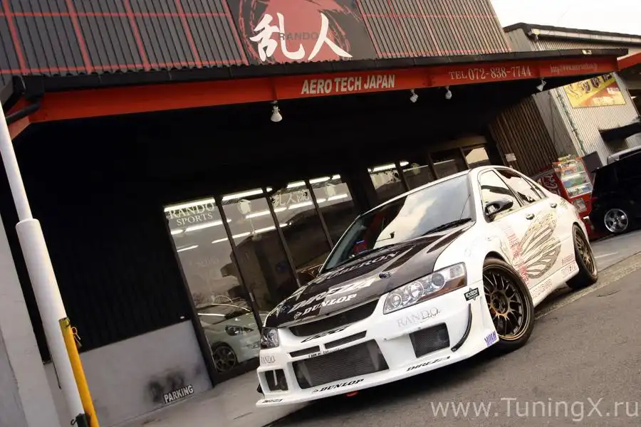 Компания RAYS Engineering занимается поддержкой огромной сети тюнинговых магазинов в Японии. Они поставляют продукцию Volk Racing и многих других производителей. Скорее всего, если магазин расположен в Осаке, то он сотрудничает с RAYS. Rando – более мелкая компания, сотрудничающая с коллективом RAYS и специализирующаяся на изготовлении аэро-китов. Также они делают тюнинг для любителей супермощных машин, таких, например, как Lancer Evolution VIII, который вы здесь видите.