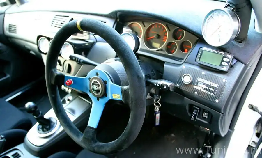 Внутри Rando Evo сохранен заводской салон, но добавлен каркас безопасности. Оригинальные сидения Recaro заменены на Recaro SPG, а заводская подушка безопасности перекочевала на руль Sparco. Основные приборы собраны на центральной консоли, а рядом установлен HKS EVC. Также на приборной панели появилась замечательная кнопка запуска двигателя.