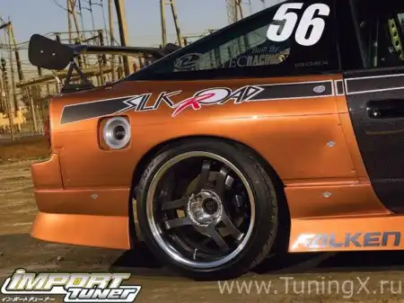 При всем при этом не стоит забывать о том, что для того, чтобы прийти к финишу первым, нужно сначала привести проект к финишу. Оджас оборудовал 240SX крепежом Dzus, позволяющим быстро снимать почти все внешние панели кузова. Боди-кит Origin Aggressive вкупе с передними деталями, превратившими S13 в очень похожий на S15 автомобиль, снимается всего за несколько секунд. Если во время соревнований какая-то кузовная деталь повредится, Оджас может легко снять нужную секцию и продолжить гонку. Однако это не касается некоторых жестко закрепленных деталей кузова, таких как карбоновые зеркала заднего вида Vision, карбоновые капот, багажник и двери Seibon. Все это было установлено на машину в целях снижения ее веса. Аэродинамическими составляющими машины заведуют заднее антикрыло APR Performance и нижний спойлер Silk Road. Но это важно скорее для кольцевых гонок, чем для дрифта.