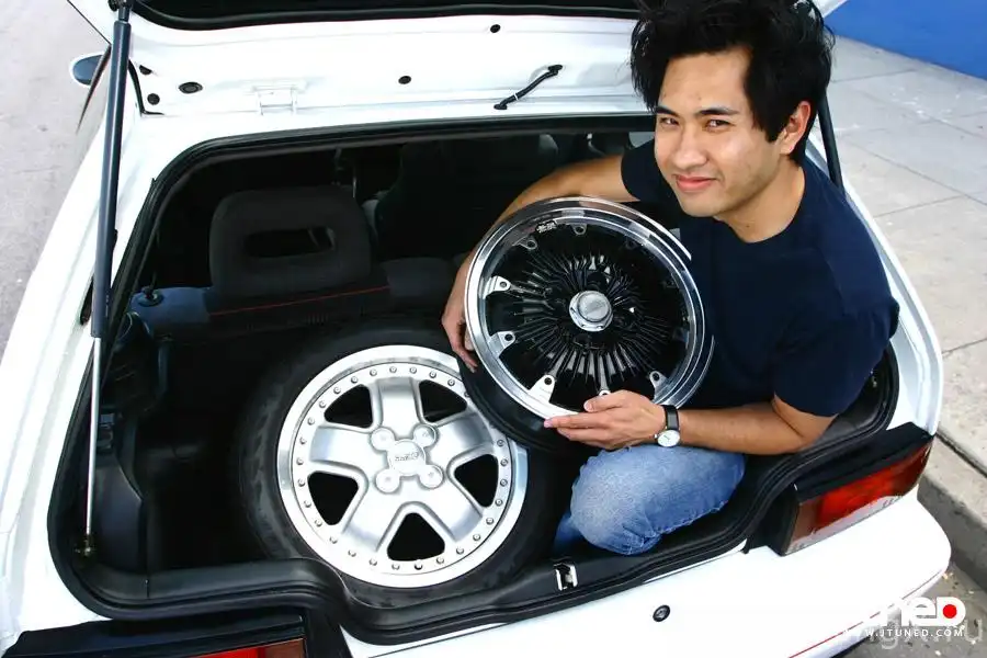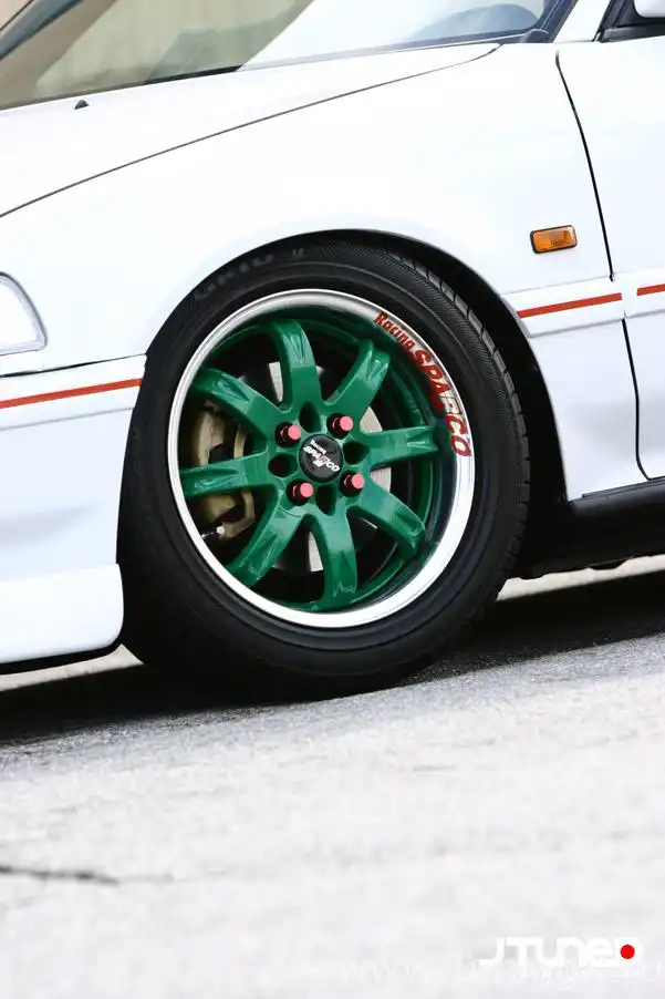 А еще он серьезно коллекционирует колеса, если вы еще этого не заметили. В собственности у него побывало много модных дисков, выпущенных под маркой Mugen – вроде CF-48 и MR-5, вместе со всеми сопутствующими им аксессуарами. Однако большую часть времени мы видели его машину на этих выкрашенных в зеленый цвет дисках Racing Sparco RR – колеса Mugen он хранит в надежном месте.