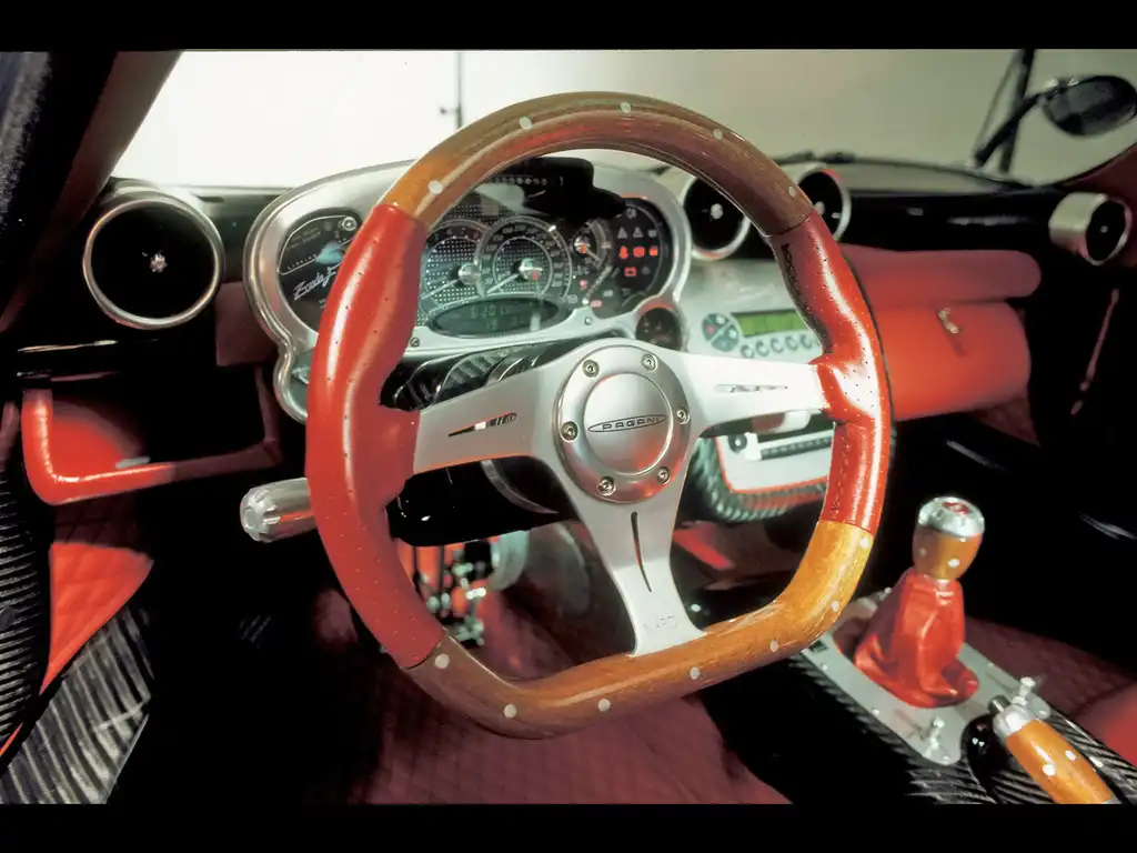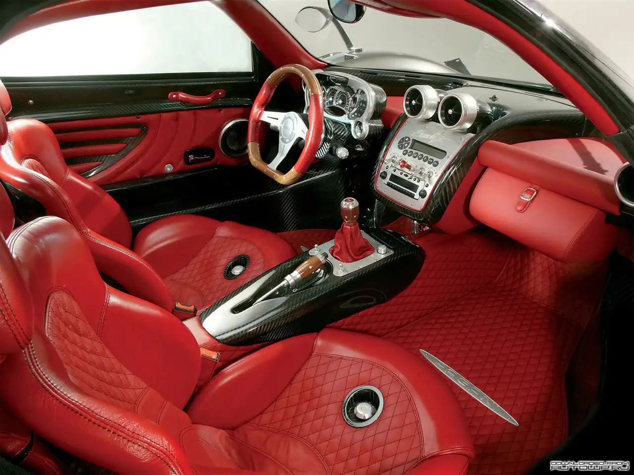 Салон спорткара продолжает поражать своей экстравагантностью. Здесь преобладает комбинация ярко-красной кожи с черными карбоновыми вставками. Цепкие анатомические сиденья пронизаны сеточкой мелких швов. В таком же стиле выполнены и кожаные коврики. Руль также кожаный, с деревянными вставками, как на штурвале спортивного катера. Обод его снизу обрезан, чтобы не мешать ногам водителя. Из дерева выполнены ручки рычага КПП и ручника на карбоновом центральном тоннеле. Педали – маленькие алюминиевые диски. А перчаточный ящик похож на дамскую сумочку от кутюр. Отдельного внимания заслуживает декорированная полированным алюминием панель приборов. По центру – большие циферблаты тахометра и спидометра, размеченного до 400 км/ч. Приборы напоминают авиационные. Усиливает эффект прозрачная крыша: в кокпите с очень большой площадью остекления действительно чувствуешь себя как в кабине истребителя. Салон Zonda F отнюдь не назовешь спартанским. Здесь и кондиционер, и качественная аудиосистема, и спутниковая навигация. Разве что подушек безопасности нет. Из-за этого автомобиль запрещен в США. Однако это не мешает заокеанским миллионерам покупать Zonda F, именно в Штаты ушла значительная часть спорткаров Pagani. Совсем иные ощущения в родстере Zonda F Roadster. У него, конечно, есть карбоновый жесткий верх. Но намного лучше промчаться в открытом всем ветрам салоне.