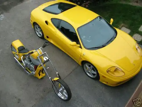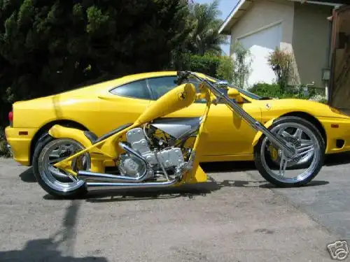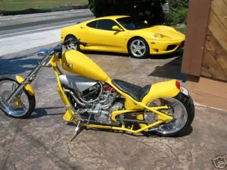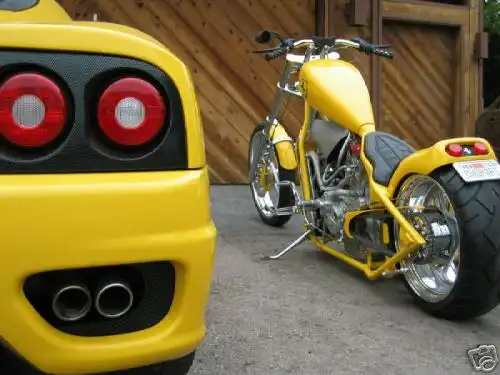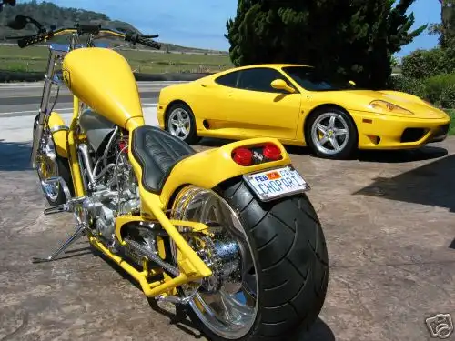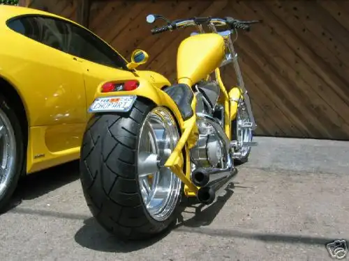 Дело в том, что у создателя этого мотоцикла есть автомобиль-мечта, а именно Ferrari F360. К сожалению, накопить на полноценный спорткар никак не получается, зато есть кое-какой опыт в постройке мотоциклов. Поэтому и создавался этот чоппер с оглядкой именно на спорткары. Почему создавался именно чоппер, а не спортбайк? Да кто же об этом знает, может быть так просто неинтересно. Тем не менее, по всем законам спортивных автомобилей байк наделили упомрачительно жесткой подвеской. Скажем прямо - её просто нет! В какой то мере ситуацию спасает огромное заднее колесо размерности 8.5X18 и шириной 240 мм! Теперь ты понимаешь, почему за рулём этого аппарата не стоит особенно расслабляться?