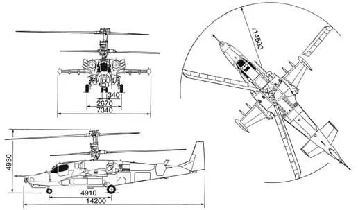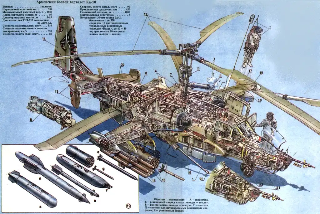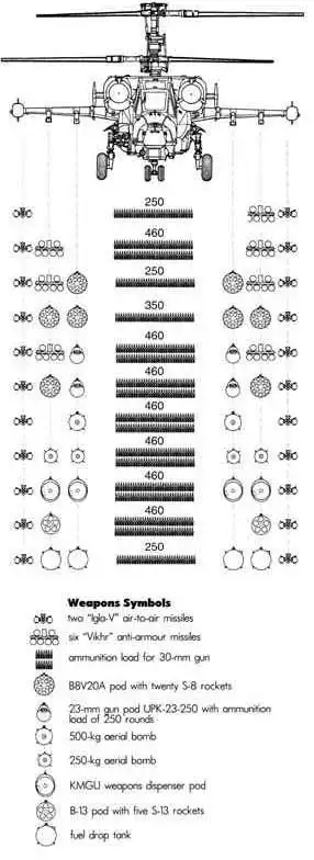Ка-50. Боевая нагрузка вертолёта достигает почти 2 т. В состав вооружения могут входить противотанковые ракеты, НУРы различных калибров, управляемые ракеты "воздух-воздух", пушки, бомбы и другое вооружение.