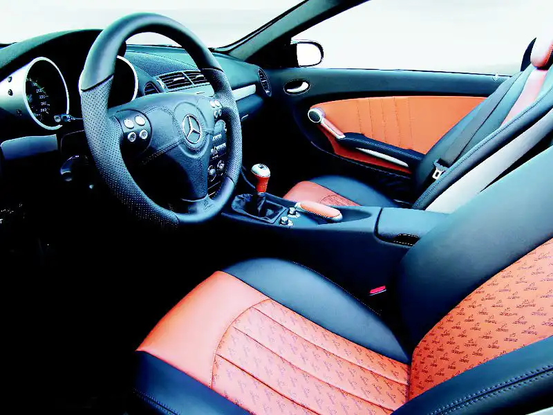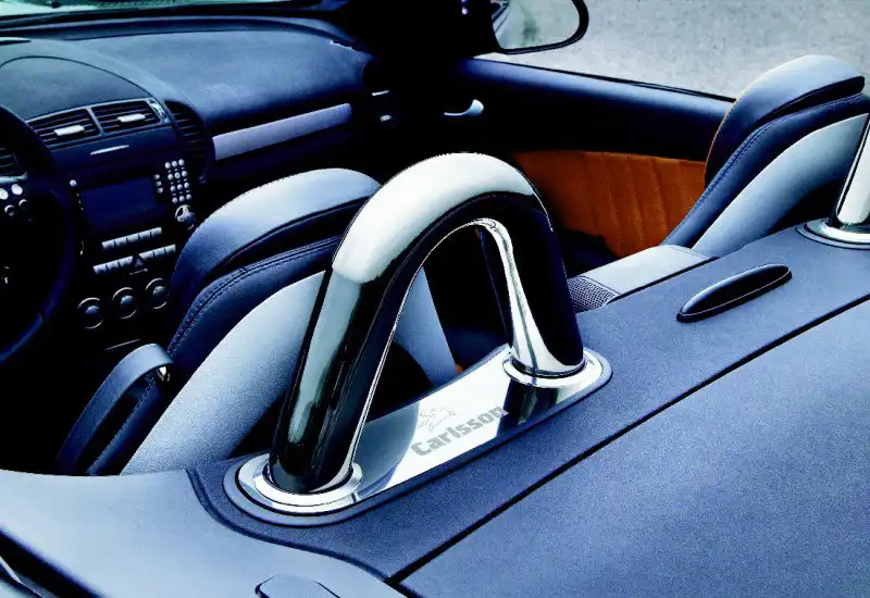 Красивой внешне машине был подарен шикарный интерьер. Здесь тюнингеры из Carlsson постарались. Спортивные сиденья полностью перетянуты высококачественной кожей двух цветов – красного и черного. Причем красная вставка по центру сиденья щеголяет фактурой со множеством логотипчиков компании. Красной кожей и алюминием отделаны рукоятки переключения коробки передач и ручного тормоза. Под ногами – алюминиевые накладки на педали и площадку для отдыха левой ноги, а также эксклюзивные велюровые коврики с вышитым логотипом Carlsson. На порогах – фирменные хромированные накладки. Но особенно притягивают взор отполированные дуги безопасности с фирменным логотипом компании.