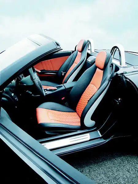 Чтобы окончательно развеять сомнения, что это – не стандартный Mercedes-Benz SLK350, устанавливается изящный аэродинамический обвес, подчеркивающий динамику и стремительность компактного родстера. Передний бампер по размерам и расстоянию до асфальта не соперничает с ножом бульдозера и не пытается придать автомобилю сходство с болидом Формулы-1, но при этом ясно дает понять, что машина не простая. Продолжают заданную тематику и мощные профилированные накладки вдоль порогов и “псевдо-диффузор” снизу заднего бампера. Небольшой спойлер на крышке багажника увеличивает прижимную силу на задней оси. Финальный аккорд – смена трехлучевой звезды на фирменные эмблемы Carlsson.
