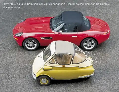 Тут-то в дело и вступила BMW. В 1954 году она приобрела у итальянцев не только лицензию на выпуск Изетты, но и всю производственную оснастку. Впрочем, инженеры BMW творчески подошли к делу, существенно пересмотрев конструкцию, и главное — снабдив машину более надёжным и мощным четырёхтактным мотоциклетным мотором. На первую германскую модификацию этой машины — BMW Isetta 250, выпускавшуюся с 1955 года, — ставили 1-цилиндровый 245-кубовый мотор с воздушным охлаждением, выдававший 12 лошадиных сил. В следующем году появилась BMW Isetta 300. Ее 298-кубовый моторчик показывал на 1 лошадиную силу больше. Максимальная скорость осталась прежней, однако машина стала более приёмистой, особенно на подъёмах.