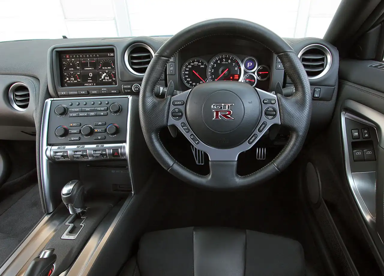 Как и в предыдущем GT-R, на дисплей можно выводить различные параметры движения вроде угла поворота колёс или уровня продольных и поперечных ускорений. А три рычажка на центральной консоли управляют работой трансмиссии, амортизаторов и системы стабилизации (режимы Normal, Comfort и R).