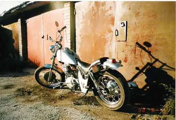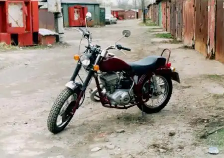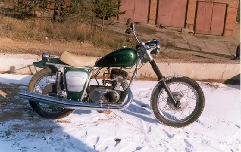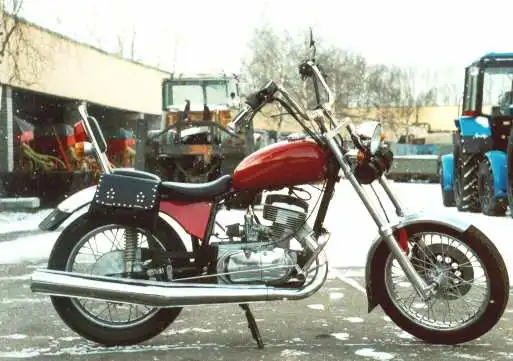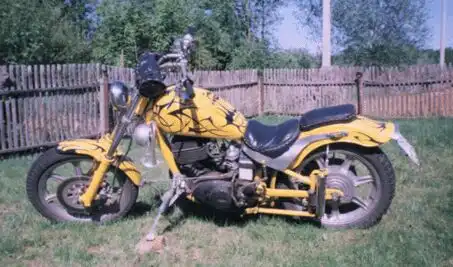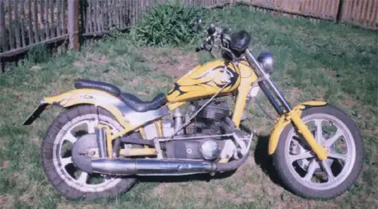 Осенью 2001 года я купил старенькую "Иж-Планету-2" в качестве будущего хозяйственного мотоцикла "на каждый день". В мотоцикле обнаружились убитые детали в обьеме 50 % от всей конструкции. Стало быть, я-владелец рамы и картера с документами. Все это за тысячу вечнодубовых + перевозка из Усолья в Иркутск. Не дорого,а стало быть-и не обидно. Куча металла затащена в квартиру на третьем этаже, разобрана до винтика.....и тут я остановился. Спросил себя-а стоит ли собирать обратно совкобайк, как он есть, когда можно сразу внести свои коррективы внешности и содержимого? Точкой отсчета при постройке, и деталью, задающей тон,стал метровой ширины руль "драгбар" на 15-сантиметровых кронштейнах. Дополняет его панорамное зеркало на коротенькой "ножке". Двигатель оснастил поршневой "Планета-5-01" и однотрубной выпускной системой. Приобрел колесо от "Планеты-Спорт" с родным тормозным механизмом, а также новые перья от "лицензионной" Ижевской передней подвески. Идею расточить под эти перья старые траверсы отбросил сразу - лопнут на первой же кочке. Из 20-миллиметровой плиты стали 30хгса были отфрезерованы новые траверсы с необходимым запасом прочности. Заднее колесо сборное-ступица от старого "Ижа",новые спицы и обод от "Планеты-Спорт". В шарнир маятника задней подвески установлены парные подшипники качения и уплотнительные сальники. Нашел бензобак-"каплю" от "Иж-56". Фара стандартная,стоп-сигнал от грузового "газика", указатели поворота-малые иномарочные "противотуманки" с вмонтированными габаритами "м-412". Никелированные кронштейны для светотехники переделаны из деталей сантехники и вешалки под полотенце (если кто обзовет байк унитазом-убью на месте). Сиденье взял от мотороллера "Хонда-Такт",оно крепится на шарнире,как "лягушка" у старинных "Ижей" и обтянуто светлой кожей. Подножки водителя точеные из стали 45 и хромированые,к стандартным кронштейнам крепятся через приваренные резьбовые втулки. Мотоцикл покрашен автоэмалью "Штандокс" двух оттенков-"Игуана" и "Супер-Бриллиант". В управлении "Весна" напоминает поезд - сочетание мягкой подвески с неплохой устойчивостью на курсе. За рулем комфорт полный на любой скорости. К тому же "полуяпонское" сиденье не нарушает кровоток ,простите, причинных мест водителя,за что я ругаю стандартные "рубленые" седла "Ижей".По поводу внешности. Есть у нас славная традиция-строить устрашающие чопы,черно-хромовые чудища. А мне хотелось сделать радостный,"весенний" мотоцикл, чтобы задавал такое же настроение. Думаю,получилось.