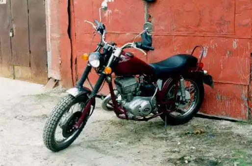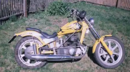 "Этот ПС 1982 года выпуска был куплен практически в оригинале, переделал я его в 1999-2000 г. По техпаспорту цвет был указан оранжевый и начались размышления, как бы его покрасить поинтереснее. Замена цвета отпала сразу, т.к. лишний визит в авторегистр и его кассу не входил в мои "творческие" :) планы. При очередных посиделках в гараже взгляд упал на этикетку 8-ми градусного пива "Сарвик" ( в переводе "Рожок"). Против этого пива у нас даже церковники выступали - на этикетке рога и восемь скачущих чертей, по одному на каждый градус. Как настоящий любитель пива я и подумал, что это как раз то, что нужно. Потом испытывал лёгкий дискомфорт после покраски - две ночи эти черти скакали перед глазами ( так задолбался трафареты вырезать ). Но это лирика, теперь по теме. Раму использовал родную, переваренную. Задний маятник удлинённый. Бак "ИЖ-56", фара М1-М"Москва". Руль от какого-то японца, задний фонарь и воздушный фильтр от "Паннонии". Поворотники от "Газ-51". Крылья : переднее - обрезанное от "Минска", заднее от "Урала". Колёса: переднее - ступица кроссовый "ЧЗ-125", обод кроссовый "ИЖ" ( резина 90-90/21 ), заднее - "ПС" ( резина 130-90/18 ). Подрамник для подножек съёмный . Передняя вилка - "Иж-ПС". вместо пробок вкручены удлиннители. Задние амортизаторы поставил от старого "Ижа", но при езде вдвоём их пробивало, пришлось поставить Псовские. Держатель для пива - крепление автомобильного огнетушителя. Покраска из баллончиков "Мотип" ( не считать за рекламу :) ) с последующей лакировкой в автомалярке. В итоге получил удовольствие от проделанной работы и 1000 евро за мотоцикл. Мой дружок получил мотоцикл и "ник"( думаю понятно какой ), под ним он и зарегестрировался на сайте. С тех пор мотоцикл обзавёлся кожаными сумками, карбюратором "Микуни", фильтром низкого сопротивления.