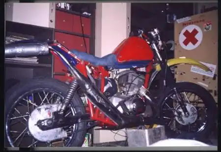 Всё началось с покупки рамы с документами. Дальше - двигатель ( был куплен в сборе ). Рама переварена , бак от древнего ДКВ , сиденье самодельное. Переднее колесо -ИЖ-ПС , резина 3,00-19. Заднее колесо : ступица и звёздочка от ИЖа-многодневки, обод - старая Ява , резина 130/90-16.Передняя вилка : крыло , траверсы и нижние стаканы - ИЖ-ПС , трубы- кроссовый ИЖ. Заднее крыло - Урал. Глушитель - Планета с "рыбьим хвостом" от ИЖ-49. Передняя фара - противотуманка с элементом под Н-4 , стоп-сигнал - передний поворотник от фольксвагена-жука ( жёлтое стекло покрыто красным лаком ) . Указатели поворотов _ Газ-51. Вроде всё . Мотоцикл купил мой друг , откатал три сезона и продал его в Швецию. На двух последних снимках Планета запечатлена на память перед продажей.