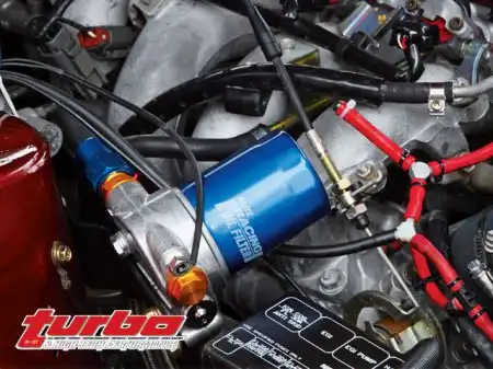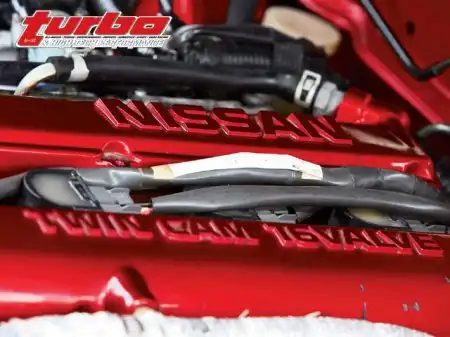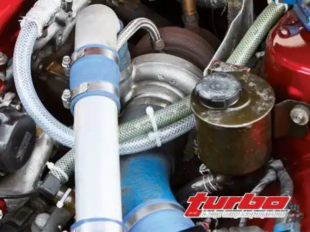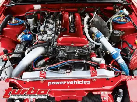 SR20DET от S14 1997 года, турбина Trust TD06-20G, выпускной коллектор Trust, внешний вейстгейт Trust, приемная труба Trust, стоковый катализатор (согласно правилам соревнований), выпускная система Yashio Factory, впускная труба GReddy, воздушный фильтр HKS, инжекторы на 700cc, топливный насос Nismo, датчик расхода воздуха Z32, большой сотовый радиатор, патрубки радиатора с оплеткой, интеркулер GReddy, радиатор масла с комплектом "relocation kit" от Trust, маслосборный бак Cusco, компьютер A'pexi Power FC ECU & Commander (программирование от SIMEX)