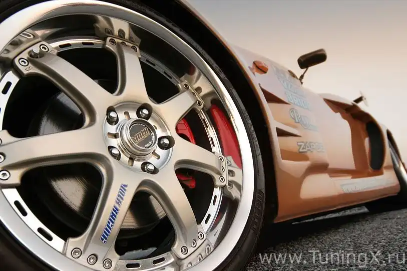 (спереди) диски 18x9 дюймов Volk Racing GT-7 с покрытием «благородное золото» и шины Yokohama