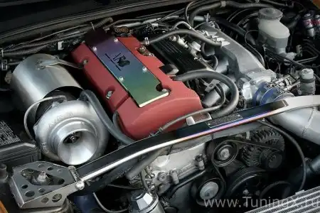 Под капотом автомобиля - мощность, позволяющая преодолеть четверть мили всего за 11 сек. Благодаря чему характеристики автомобиля получились столь внушительными? Тони заключил контракт с LoveFab на этот проект. LoveFab уже работала с Стивеном Пападакисом над его S2000 для дрифта и поэтому у них не было проблемы с изготовлением надежного турбо-кита для Тони. Компания LoveFab изготовила выпускной коллектор, в который был установлен турбокомпрессор Garrett GT3071R. Был установлен интеркулер GReddy, а для того, чтобы температура не превышала разумных пределов, был добавлен радиатор Koyo. Двигательный отсек с деталями от ARC включает титановую переднюю распорку стоек от Opak Racing, обычные 3-дюйомвые выхлопные трубы и 4-дюймовый впускной коллектор с фильтром K&N. И конечно, двигатель тоже был доработан. Как же мы могли забыть упомянуть об этом?