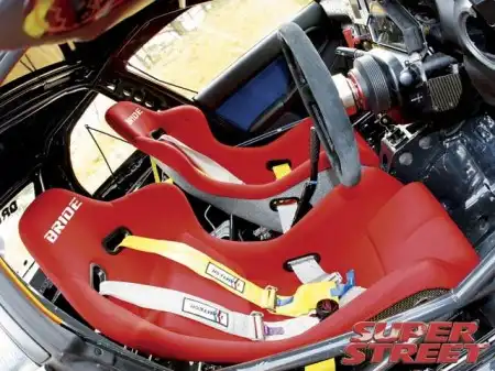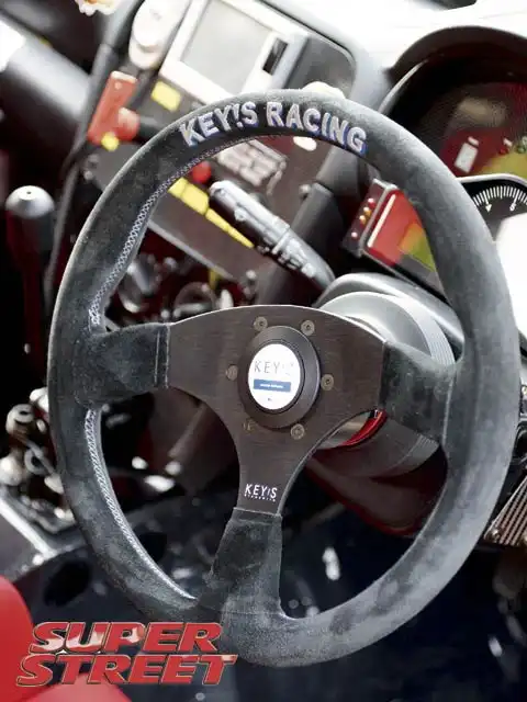 В кабине все исключительно функционально. Зона, где находилось заднее сиденье, была полностью выпотрошена, а теперь здесь располагается огромный трубопровод, ведущий от задних дверей к расположенному сзади радиатору. Единственное, что находится внутри салона, помимо специально изготовленного каркаса, - это ярко-красные ковшеобразные сиденья Bride и ремни безопасности Teamtech с эксцентриковыми замками. Кумакубо также установил 350-миллиметровый замшевый руль Key's Racing с быстросъемной втулкой и приборную панель с датчиками Stack. Чтобы придать Импрезе более гоночный вид, JUN обили пол машины специальными металлическими пластинами. Пока я фотографировал машину, Кумакубо спросил, не желаю ли я покататься на Импрезе. Гмм, нууу... а как по-японски "Ну *птыть же!"? Я всегда мечтал прокатиться с самим Королем "Tsuisou" ("Tsuisou" значит "тандем") в его собственных угодьях, по южной площадке "Эбису", где проводятся соревнования D1. Пристегивая себя к сиденью, я спросил у Кумакубо, как ему нравится Impreza в сравнении с "ичиго" (его знаменитой S15 Silvia). Кумакубо улыбнулся и ответил: "Если сравнивать с "ичиго", здесь отличается позиция водителя в автомобиле. В Импрезе водительское место расположено ближе к центру машины, дальше от мотора." Из-за этого, как заявил он, во время дрифтинга угол заноса казался ему больше, чем он был на самом деле. Нескольким его друзьям, наблюдавшим за его заездами, даже пришлось убеждать его в том, что угол действительно был меньше, чем ему казалось. Кумакубо поведал, что такая же проблема свойственна 350Z и G35. Теперь он привык к этой особенности Импрезы и может достигать более глубокого угла, чем когда бы то ни было в S15.