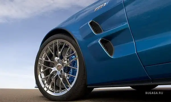 Но это еще не все! Начинаем загибать пальцы, попутно ставим себя на место того бедного мечтательного менеджера: крыша, капот, передние крылья сделаны из углепластика – в результате и престижно, и мало весит. Коробка передач – шестиступенчатая механическая с двойным сцеплением – способна передавать всю лавину мощности на задние колеса практически без перерыва. Колеса, как и положено настоящему суперкару, сзади большего диаметра, чем спереди: 20 и 19 дюймов соответственно, а на колесах этих – покрышки Michelin Pilot Sport 2, P285/30ZR19 спереди и P335/25ZR20 сзади. Эта обувка была разработана специально для Corvette ZR1. Сквозь тонкие спицы этих красивых “катков” видно керамические тормоза диаметром 15,5 дюймов спереди и 15 дюймов сзади. И так далее – от списка нововведений даже у искушенного в автомобилях человека участится пульс.