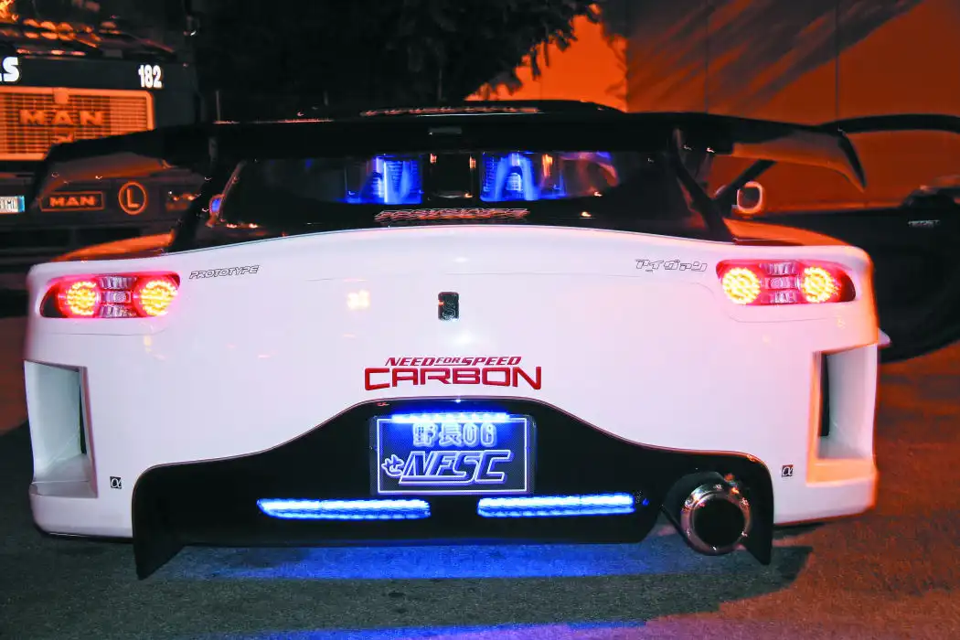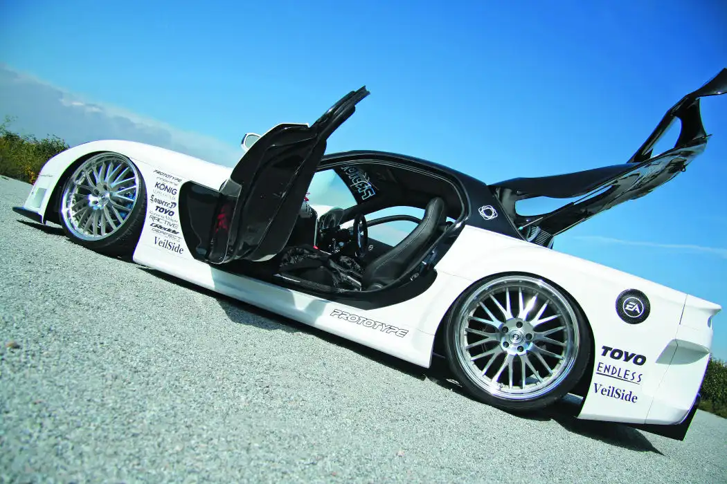 Сейчас RX-7 в любом другом обвесе смотрится, если честно, как-то бедновато и простенько. Разумеется, Prototype взяли для своего проекта Fortune, при этом немного его доработали и добавили пару «карбонятинок»: ручки да лючок бензобака. Проект не был бы испанским, если бы клиренс остался стандартным. Машину поставили на новую подвеску. Причем не как обычно – на пневматику, – а просто занизили клиренс до «минус бесконечности». При этом в арки влезли – держись – 20-дюймовые колеса! Но, конечно, не нигерские DUB’s, а настоящие гоночные Konig Netz.