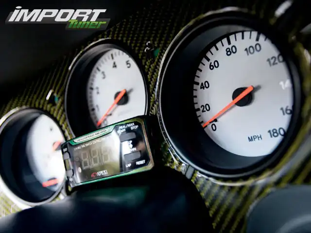 В салоне можно увидеть закрепленные на передней стойке датчики A'PEXi, показывающие значения самых разных параметров работы двигателя, его обороты и скорость машины. Это очень важно знать, когда вы едете на машине с турбонаддувом. Кроме того, это может развлечь вас в пробке или на светофоре. Blitz SBC i-D, синхронизированный с Power Meter, контролирует буст, а турботаймер позволяет турбинам охладиться после длительных заездов.