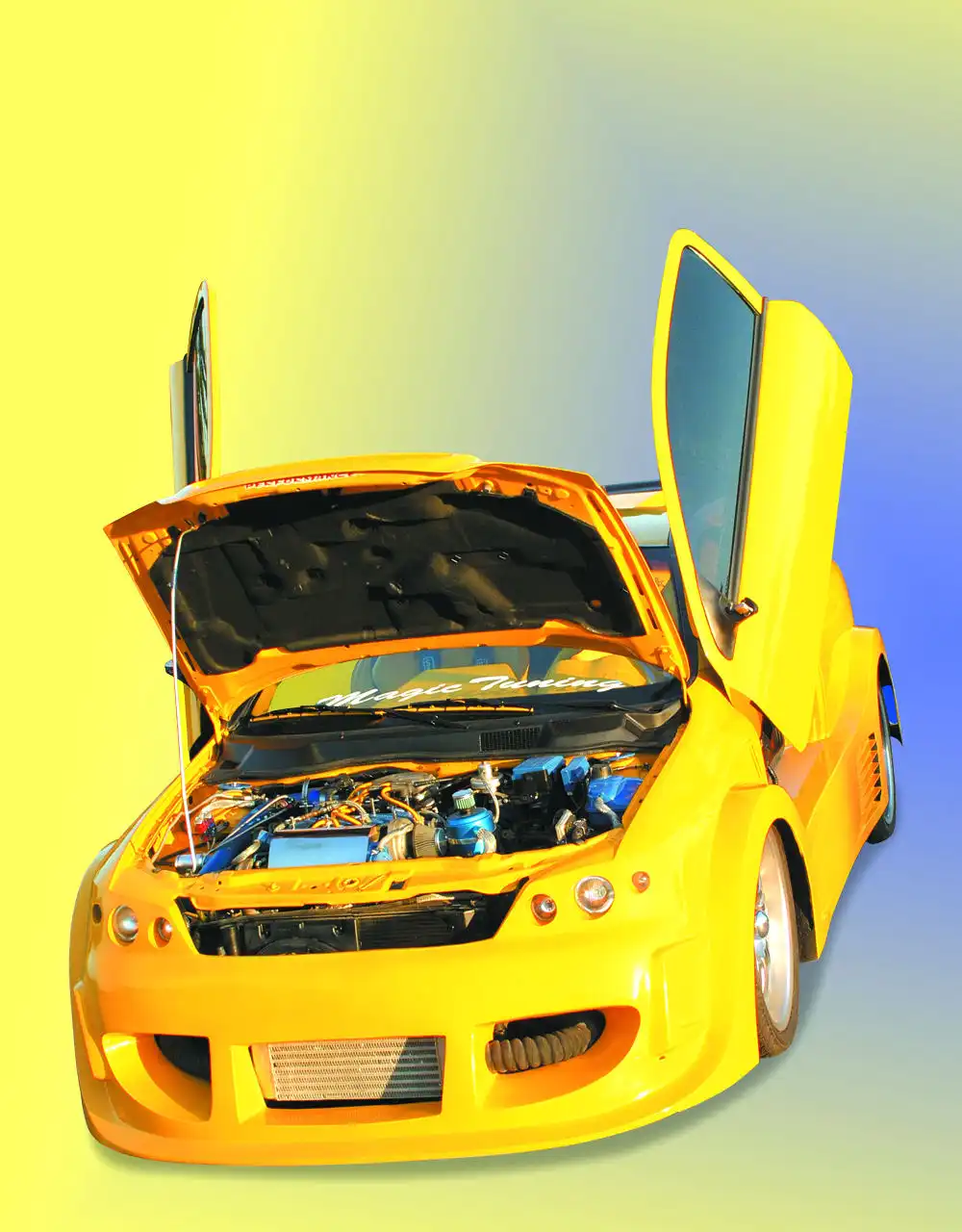 Но братья не ограничились мотором. Первое, на что они потратились– это бесшовный обвес, который выполнен по собственному проекту. Он кардинально меняет впечатление от авто. Про такую тачку трудно сказать «автомобиль гольф-класса», настолько утрирует его размеры эта раздутость. Особенно впечатляют пороги, из-за величины которых пришлось пожертвовать нижней половиной дверей. Зато теперь у этого Chevrolet появились настоящие крылья в виде lambo doors.