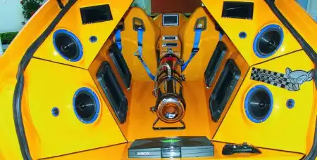 Кабина этого аппарата рассчитана на двух человек – пилота и штурмана. Это понимаешь, едва заглянув внутрь: два спортивных ковша Yak с четырехточечными ремнями – вот и весь салон. Правда, ремней для катапультации тут нет. Зато здесь есть много чего другого. Так, передняя панель отформована из пластика и усеяна приборами (где основные, а где дополнительные уже никто не разберет), белые шкалы которых контрастируют с канареечным окрасом внутренностей авто. Спидометр и тахометр – перед глазами водителя. Еще три прибора – чуть ниже. А на левой стойке и на месте крышки бардачка – еще по три дополнительных соответственно. По краям приборной панели в пластик симметрично врезаны два ЖК-монитора. На них передаются изображения с тех самых боковых камер заднего вида. А на центральном приливе панели есть еще один монитор. На нем можно увидеть, что творится позади машины глазами центральной камеры заднего вида, или использовать как телевизор.