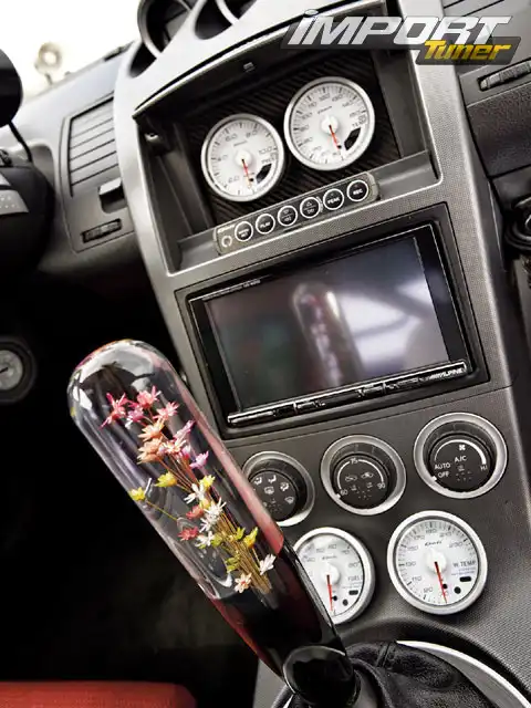 Учитывая тот факт, что массу времени владелец проводит внутри машины, наслаждаясь интерьером, Венди решила заняться внутренним обустройством своего авто с акцентом на удобство и комфорт для водителя. Стоковые сиденья уступили место ковшам Recaro SRD красного цвета, штатные ремни безопасности — ремням Takata, чтобы водитель буквально сливался со своей машиной. С имеющимися ковшами отлично сочетается руль Nardi Deep Corn 330 мм в диаметре в тандеме с таким удобным приспособлением, как U-turn Airbag Harness, которое позволяет откидывать руль на 90 градусов и без проблем садиться в авто и выходить из него. Планируя в дальнейшем увеличить мощность своего Nissan 350Z и зная о преимуществах мониторинга состояния силового агрегата, Венди установила полную систему датчиков Defi-Link System с белым фоном 60 мм в диаметре: датчик буста, давления и температуры масла, а также 52-милиммитровый, показывающий температуру воды и давление топлива, синхронизированные с системой контроля Defi Link Control Unit. Жесткость кузова, равно как и безопасность, улучшена за счет 4-точечного каркаса безопасности золотистого цвета с черными вставками, который, помимо чисто практических аспектов, несет в себе основную золотисто-черную тему, которая будет иметь продолжение при дальнейшей модификации авто. И, наконец, в салон добавили немного индивидуальности при помощи рычага переключения скоростей в японском стиле с цветком. Можете смеяться, если хотите, говорить, что она большая и уродливая. Венди сказала, что ручка останется на своем законном месте.