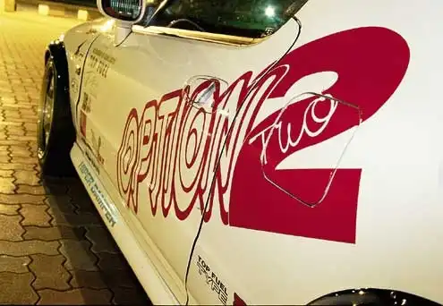 Специальной "супер-белой" краской Top Fuel покрыта вся машина, за исключением огромных оригинальных расширителей крыла Top Fuel. Они позволяют использовать чрезвычайно широкие колеса на треке и вне его. Насколько широкие, спросите вы? Автомобиль сидит на золоченых 17-дюймовых колесах Advan RG. Выбранные шины – Yokohama: 235/40R17 спереди и 245/40R17 сзади. Прижимная сила создается оригинальным алюминиевым спойлером Top Fuel Zero-1,000 GT. Конечно, машина Top Fuel не закончена без деколя Канджи "0-1,000 Powered by Top Fuel" на капоте. Украшенный множеством наклеек Top Fuel, этот маленький белый автомобиль сложно не заметить.