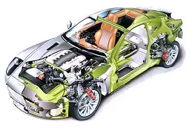 Передняя энергопоглощающая часть кузова (склеена из стекло- и углепластиковых частей) поступает в сборе от компании Lotus Engineering. Спрашивается: что остается мастерам из Ньюпорт Пэгнелл? Образно говоря, склеить автомобиль. Плюс изготовить традиционным методом вытяжки алюминиевые крышу и дверные панели. Руководство Aston Martin уверяет, что если методика оправдает себя при создании Vanquish, ею поделятся с другими отделениями Ford.