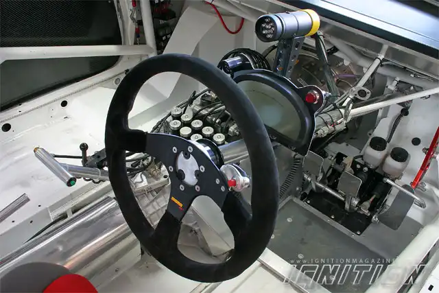 Поскольку в данной ситуации комфорт интерьера некритичен, внутреннее убранство GT-R более чем скудное. Готовясь к заезду, Риз протискивается в салон через дуги полного каркаса безопасности и пристегивается к облегченному ковшу RacePro пятиточечными ремнями безопасности. Во время заезда вся необходимая Ризу информация выводится на специальный дисплей Motec. Как же без датчиков, скажете вы? На тех скоростях, что развивает этот GT-R, пользы от них никакой, так что в качестве альтернативы в салоне установлена пара ярких индикаторов, которые дадут пилоту знать о приближении критической ситуации.