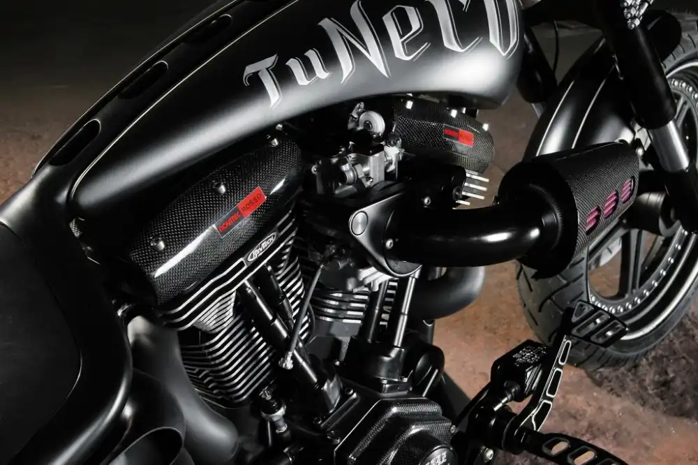 Внешние данные обоих участников "дуэта" TuNero просто сногсшибательные. Пожалуй, это лучший тюнинг проект прошедшего 2007 года. И автомобиль, и байк выкрашены в неземной черно-матовый цвет. Плюс углепластик. А что может сочетаться с черным лучше, чем углепластик? Экстерьеры проработаны настолько детально, что диву даешься. Взгляните на фото, разве это не шедевр?