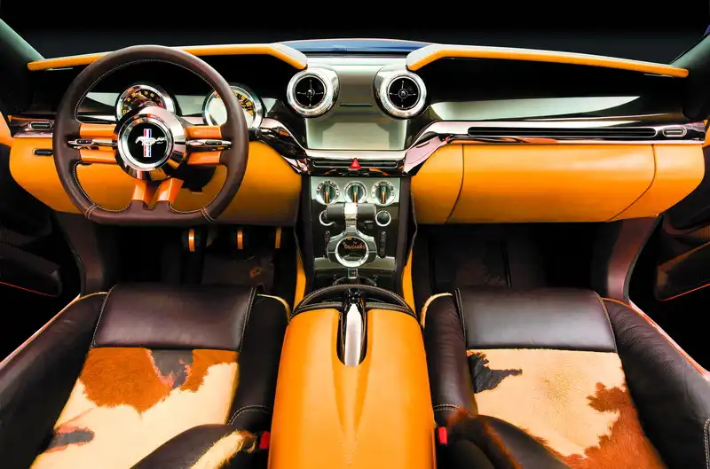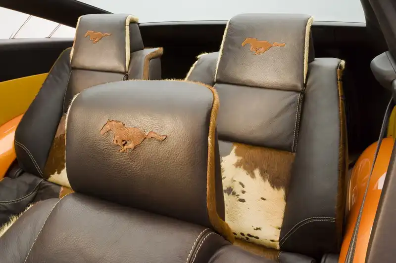 Внутри вполне традиционная для Америки симметричная приборная панель, колодцы тахометра и спидометра в классическом стиле с разметкой полукругом. Пятнистая шкура лошади в роли напольных ковриков, покрытия сидений и дверных панелей смотрится вычурно и в некотором смысле дико, однако в данном случае этот ход обыгрывает название модели. В салоне доминирует фирменный оранжевый цвет студии, но нашлось место и логотипам бегущего мустанга на подголовниках и рулевой колонке.