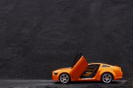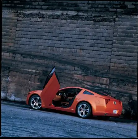 Выражение «внешность обманчива» хорошо применимо к Giugiaro Concept. Он выглядит более компактным и стремительным, чем серийный «жеребец» пятого поколения, в основном за счет укороченного заднего свеса. Но на самом деле Mustang стал шире на 30 мм спереди и 80 мм сзади. В профиль концепт напоминает итальянские спорткары. Этому способствуют сильный наклон лобового стекла и продленная линия крыши. Крылья выполнены из карбона и имеют заостренные кромки, а задние фонари и «жалюзи» на маленьком боковом окошке – дань самым первым «мустангам», которые считаются самыми грациозными. Двери у рыжего «жеребца» гильотинного типа, открываются при помощи электроприводов.