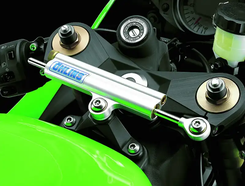 Передняя подвеска перевернутого типа такая же, как и на предшественнике, – 43 мм с полным набором регулировок, но «угол атаки» изменен в сторону еще более спортивного пилотажа. В стоковой комплектации имеется рулевой демпфер Ohlins, который был специально разработан под эту модель. Подверглись доработке тормоза. Диаметр передних дисков возрос на 10 мм (310 мм), а толщина, соответственно, уменьшилась. Сами системы – радиального гоночного типа от традиционного для Kawasaki производителя Tokico. Сзади – один диск 220 мм с однопоршневой скобой. Чтобы уменьшить неподрессоренные массы, конструкторы разработали более легкие колесные диски. Изменились дизайн и расположение «спиц». А как вам зеленая окантовка по радиусу?