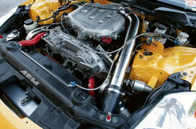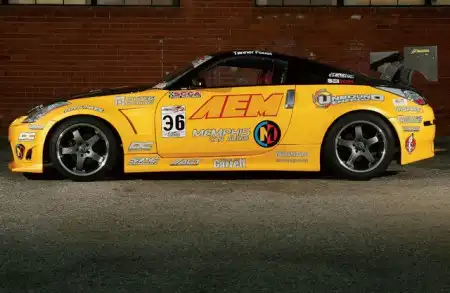 Дрифтмобиль Таннера Фоста, на котором он не раз становился победителем гонок в категории Formula D и американского D1 GP, – заднеприводный Nissan 350Z с двигателем VQ35 со «стадом» в 450 «лошадей» под капотом. Роль краеугольного камня в тюнинге авто сыграли две турбины Garrett GT25R. Кроме того двигатель был усилен кованым коленчатым валом, поршнями JE, обеспечивающими степень сжатия 10:1, поршневыми кольцами JE и сделанными на заказ шатунами Eagle. Поддон картера двигателя от APS – единственная деталь системы смазки, подвергшаяся тюнингу. Тюнинг блока и ГБЦ ограничили заменой стоковых пружин клапанов на пружины Jim Wolf. Выпускной коллектор от APS используется вкупе с двумя турбинами Garrett и алюминиевым ГБЦ VQ. Выброс выхлопных газов происходит через сделанную на заказ выхлопную систему на основе трубы диаметром 3,5 дюйма.
