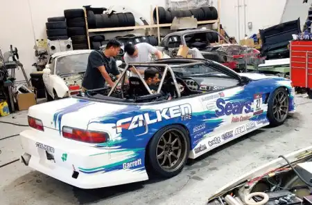 Дрифт-кар Бена Шварца – это гибрид кузова и ходовой части Nissan Silvia S13 и двигателя от Honda S2000. Распределительные валы, пружины клапанов и коленчатый вал Crower пришли на смену стоковым деталям в комплектации двигателя. Также в автомобиль была установлена сделанная на заказ из алюминия выхлопная система по проекту самого Бена Шварца, работающая после турбины Garrett GT28RS. Благодаря такой комплектации мощность двигателя достигает 350 л.с. Катается этот болид на комплекте восемнадцатидюймовых колёс Work Emotion Kai с резиной 9,5 дюймов спереди и 10,5 сзади. Покрышки с индексом RT-615 специально для дрифта выпущены компанией Falken. Для своевременной остановки перед возникшими на гоночном треке препятствиями используется тормозная система Project.
