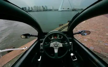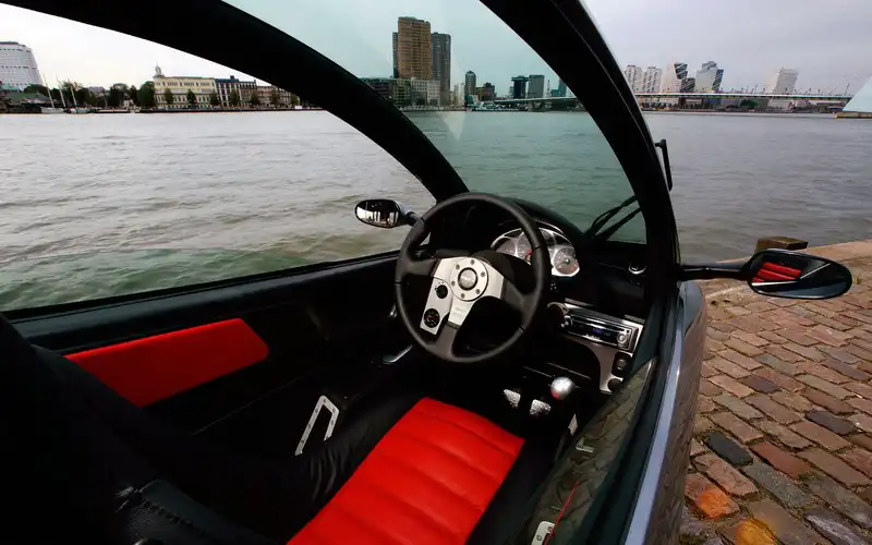 Машина имеет 15-дюймовые легкосплавные диски сзади (резина – 195/45), спереди – 17-дюймовое колесо (140/70). Интерьер чисто автомобильный – трехспицевая спортивная баранка Momo, приборная панель, отделанная первоклассной кожей, с множеством циферблатов. Помимо этого, в списке оснащения Carver One – «музыка» с mp3, GPS-навигация, функция Bluetooth, дополнительный аккумулятор и даже небольшая алюминиевая полка для перевозки багажа. Кстати, верхняя часть крыши съемная…