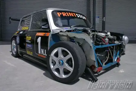После того как основные работы были закончены, автомобиль был протестирован на стенде, где замерили мощность двигателя. Выяснилось, что под капотом этого маленького автомобиля прижилось «стадо» в 310 «голов». Для работы с таким поголовьем трансмиссия Mini была заменена деталями от ST190 Toyota Corona, установлен усиленный маховик и двухдисковое сцепление. Тормозная система автомобиля – элементы системы Mazda Series 4 RX7 спереди и комплект тормозных дисков от Suzuki GSX 1100 сзади.