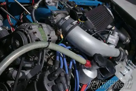 Специалисты решили использовать турбокомпрессор Series 5 от Mazda RX7 в связке с крыльчаткой компрессора типа T04b и 42-миллиметровым вейстгейтом. Охлажденный воздух подаётся через воздушный фильтр K&N и систему из сделанных на заказ труб. Ну а управление двигателем это компьютер Link и впрыск EFi, электронное зажигание и комплект свечей и проводом от NGK racing.