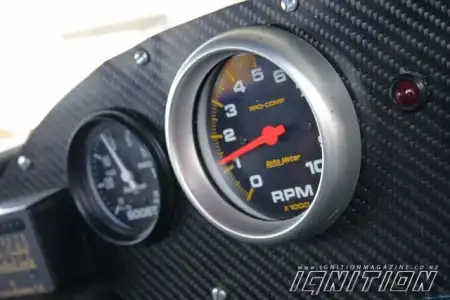 После всех этих манипуляций пришло время для работы над салоном авто. Первым делом были установлены два спортивных кресла Racetech с ремнями безопасности с креплениями в пяти точках. За состоянием автомобиля позволяет следить целый ряд приборов, начиная от указателя давления наддува до датчика давления масла и тахометра со шкалой до 10000 об/мин. Рядом с приборами уютно расположились блоки управления системами TurboSmart (система TurboSmart – очень умное приспособление благодаря которому давление, развиваемое турбокомпрессором, можно менять для отдельно для каждой передачи) и Link.