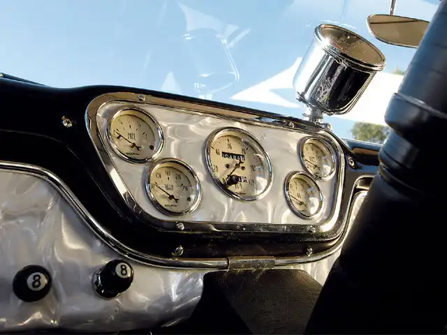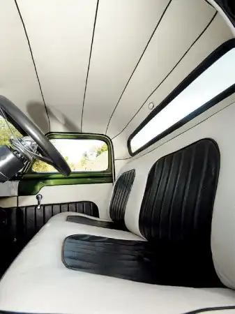В интерьере всё минималистично, винтажно, а главное очень стильно. Кожаные чехлы сидений с плетёными вставками, обшивки дверей, коврики на пол и прочие детали салона были сшиты в мастерской Rick's Upholstery. Акцент был сделан на контраст, вызванный комбинацией чёрного и сливочного цветов. Жемчужно-белый материал покрывает приборную доску, оборудованную измерительными приборами фирмы Auto Meter. Стереосистема? Какая к черту стереосистема?! Любой музыке Крейг предпочитает рычащий звук работающего восьмицилиндрового двигателя!